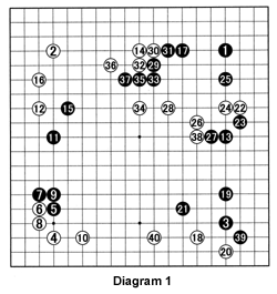 Diagram 1 (1-40): This is the fourth game from the 1992 Tong-Yang Cup five-game series in which Lee Changho (Black) beat Rin Kaiho 3-2 to grab his first International title at the age of 16. The game starts out with a huge Black moyo (framework) on the right. Although not original, ignoring 20 and expanding his moyo with 21 is a good strategy. Naturally, White invades with 22 and Black starts his attack. One would expect a 16-year-old to start a violent attack. However, Lee plays moves such as 27, which seems very slow, and 39, which takes territory instead. Will he start his attack on the white center group after White has answered with 40?