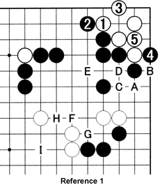 Reference 1: White can make life with 1 through 5. In the game, he played at A in the hope that Black would play at B. That exchange would give White other forcing moves at A (Black must answer at D), or even at E at a later stage. Once the exchange 4 for 5 has been made, a white move at A would be met with black C--a huge difference in eye shape and territory. Also note that once he is strong, Black might aim at F, followed by white G and black H or I to launch a strong attack on the center group.