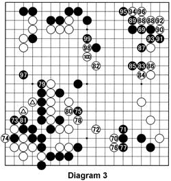 Diagram 3 (68-100): With a few moves at 70, 72, and 83, White manages to stake out a large center. On the other hand, he lets Black get away with murder (of the marked white stones, that is). As compensation, White invades and makes a comfortable life in the top right corner. The game is very close, but it seems hard for White to make enough points in the center.