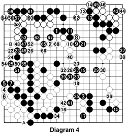 Diagram 4 (101-150): It is surprising White forces the endgame sequence 4 through 7 so early. On the other hand, it is difficult to predict what happens when Black would play at 4 instead of at 3. If White answers at 6 to make his group alive, that would mean a difference in the final outcome of the game and Black would have won. It is, however, likely White would have seized the opportunity to start a ko at A throwing the game in confusion.