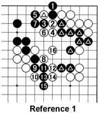 Reference 1: In response to White's marked stone, if Black descends to 1, White will force 2 through 7, then play the sequence through 16. Black's marked stones are in trouble.